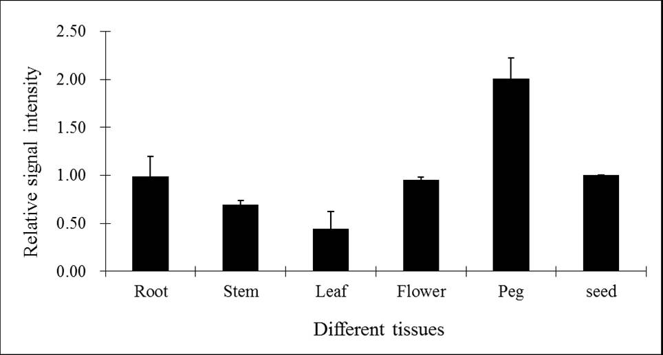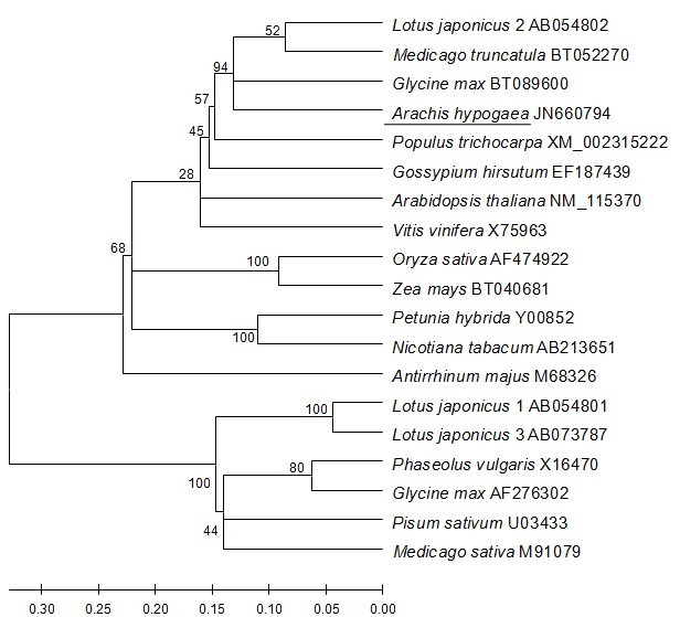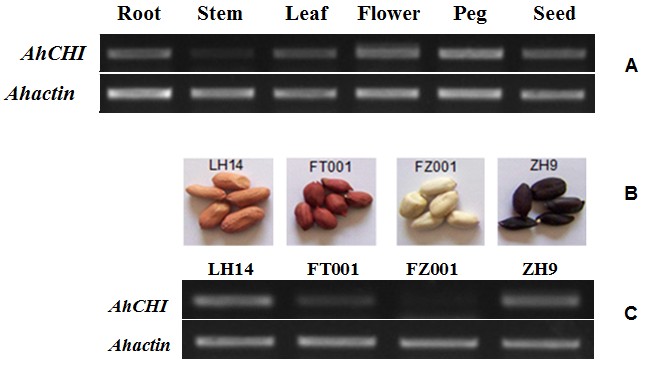Chalcone isomerase (CHI) is the key enzyme that catalyzes chalcone into (2S)-flavanol or (2S)-5-desoxidation flavanol. The full length cDNA (1050 bp) of AhCHI (Arachis hypogaea CHI gene) was cloned by large scale EST sequencing using a peanut immature seed cDNA library. Sequence analysis results indicated that it was a type I CHI gene (with the accession number JN660794). The ORF of AhCHI was 768 bp, encoding a peptide of 255 amino acids with a pI of 5.189. Sequence alignment showed that the coding region of AhCHI gene is highly conserved to compare with CHI genes from other plant species. Peanut cDNA microarray and semi-quantitative RT-PCR analysis indicated that AhCHI was highly expressed in pegs. The expression level in flower and root was higher than the expression level in stem and leaf. AhCHI was expressed in a high level in seeds with a purple seed coat, while its expression was low in seed with white seed coat.